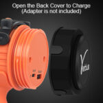 Sealed Rear Cover Protect spotlight from rain and dust. while charging,Please unscrew the back cover firmly.When charging, the charger indicator light glows red.l When the battery reaches 80%, the charger indicator light glows green (means You’ll need to recharge for another hour to reach 100%)
